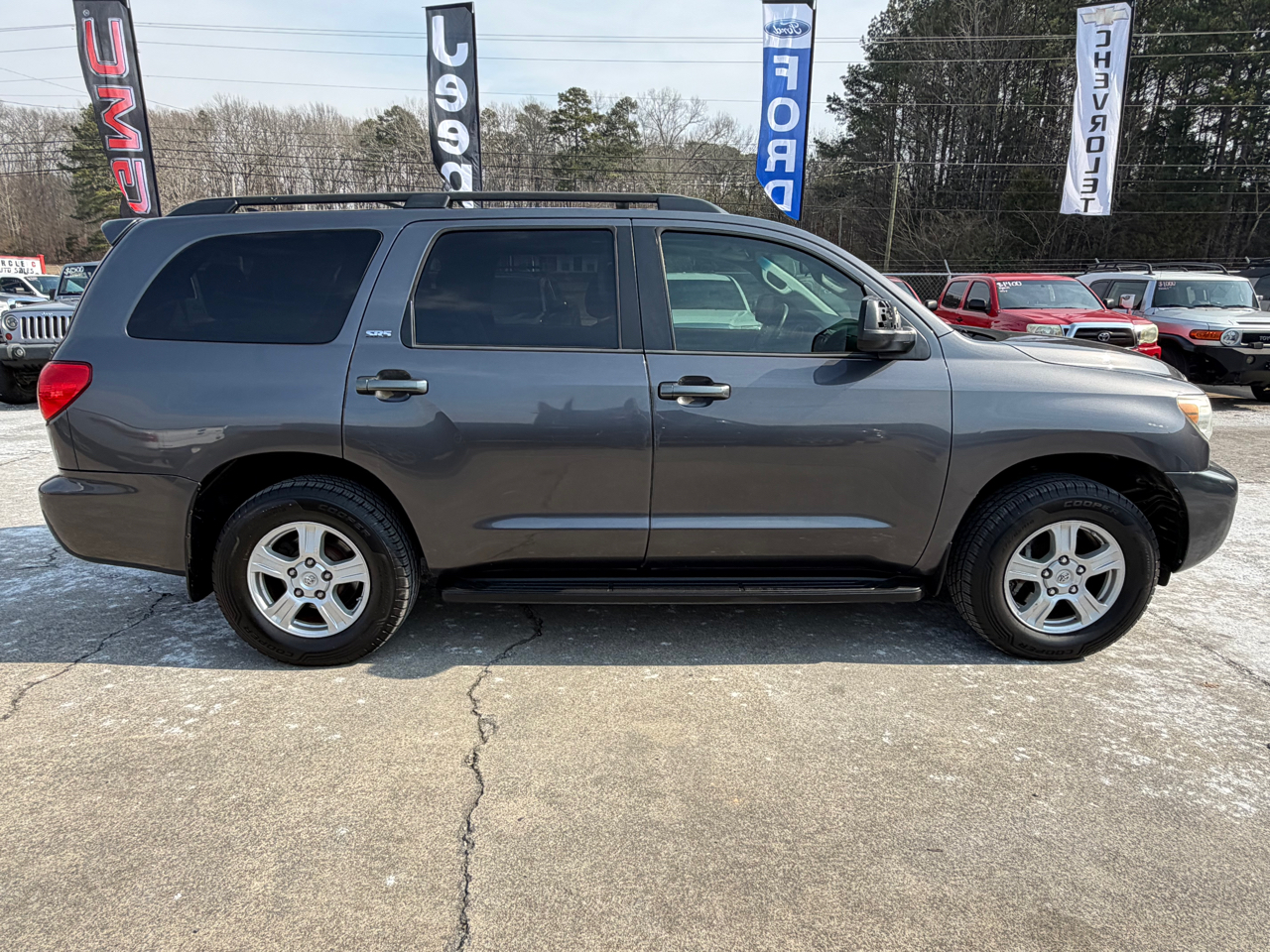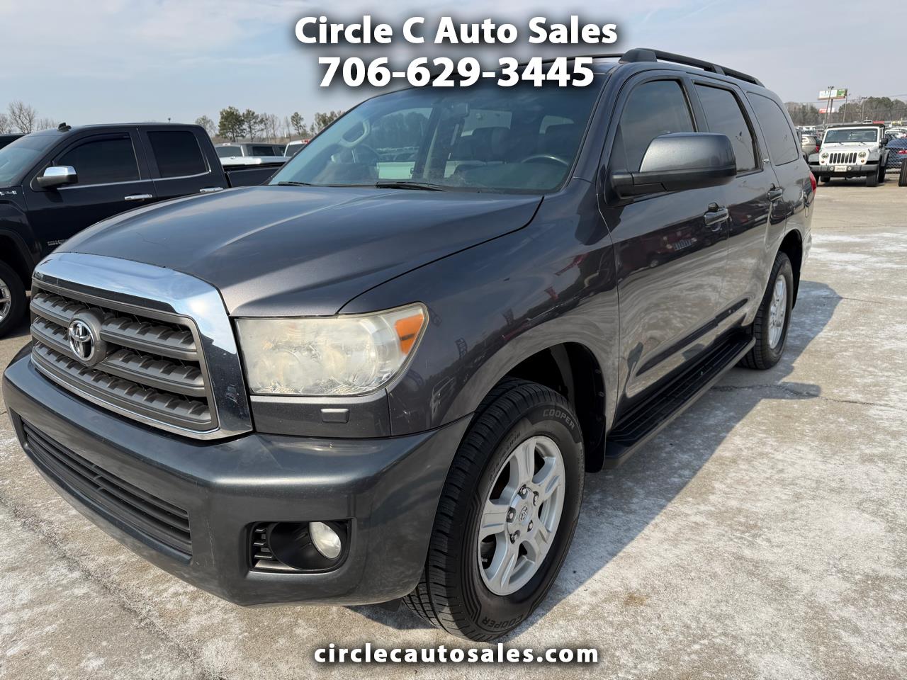 Get ready to take on the open road in style with this sleek Gray 2012 Toyota Sequoia. Packed with all the safety features you need, this SUV ensures peace of mind for both you and your little ones on every adventure. Experience the power and convenience of keyless entry and a user-friendly steering wheel mounted control system as you cruise in comfort with separate climate controls. The spacious interior boasts a CD player for road trip tunes, as well as a convenient trip computer to keep you on track. With automatic headlights and fog lights, visibility will never be an issue no matter the weather conditions. The rear spoiler adds a touch of sportiness to the overall look, perfectly complementing the rugged Alloy Wheels. Whether you're loading up for a weekend getaway or simply tackling daily errands, the Load Bearing Exterior Rack and Full Size Spare Tire have got you covered. Don't miss out on this fantastic blend of safety, style, and functionality - come test drive this Toyota Sequoia today!Visit Circle C Auto Sales website at www.circlecautosales.com to see more pictures of this vehicle or call us at 706-629-3445 today to schedule your test drive. Thank you, and have a great day!